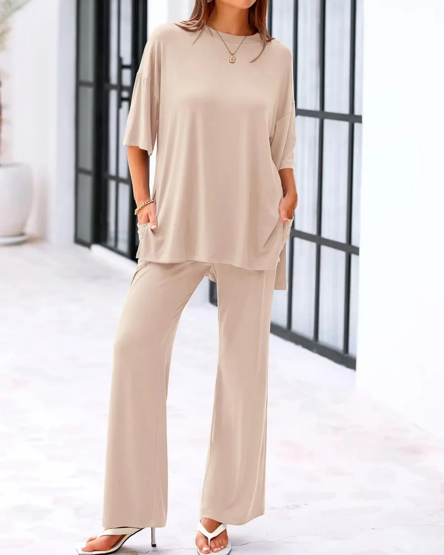 Experience ultimate comfort with this stylish 2-piece set! The loose-fit top with short sleeves offers a relaxed, breathable fit, while the wide-leg pants ensure all-day comfort and movement. Featuring practical side pockets, this outfit is perfect for casual outings or a laid-back day at home. Crafted from soft, lightweight fabric, this set combines comfort and style effortlessly.