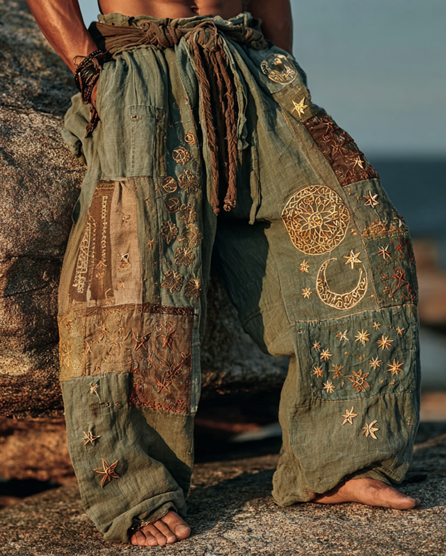 Men's Casual Star and Moon 3D Embroidered Linen Pants 4ab3