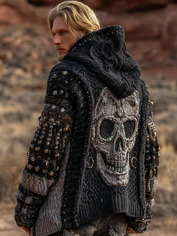 Men's Dark Style Skull Inspired Knitted Cozy Zipper Up Hooded Cardigan