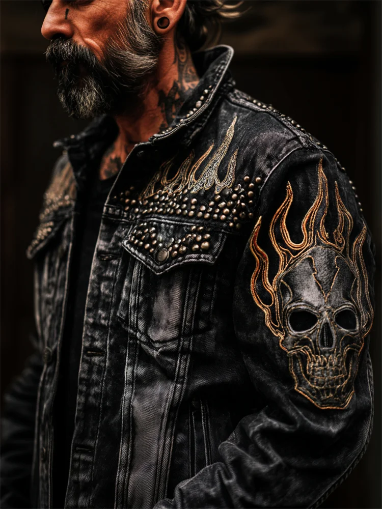 Men's Rock Skull & Flame Studded Washed Denim Jacket