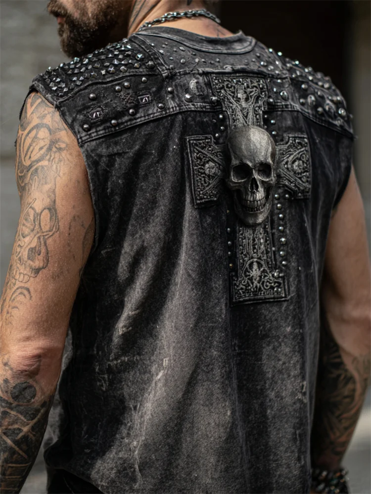 Men's Rock Style Skull Cross Studded Washed Tank Top