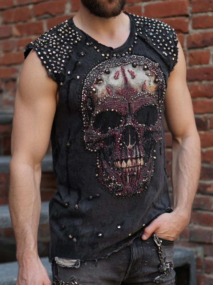 Men's Rock Style Skull Studded Crew Neck Washed Tank Top
