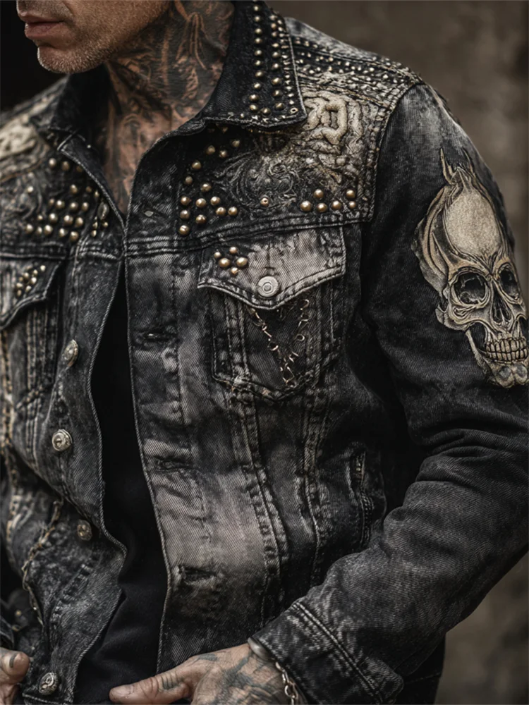 Men's Rock Style Skull Studded Washed Denim Jacket
