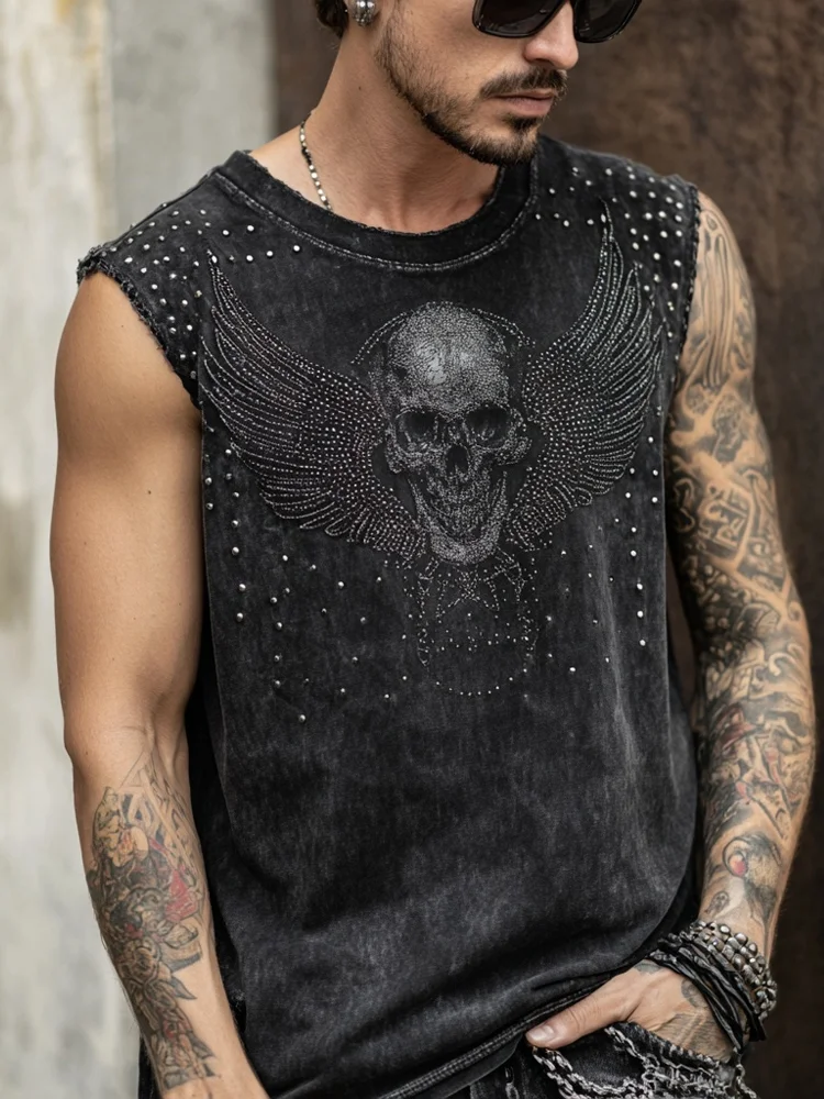Men's Rock Style Skull Wings Studded Vintage Washed Tank Top