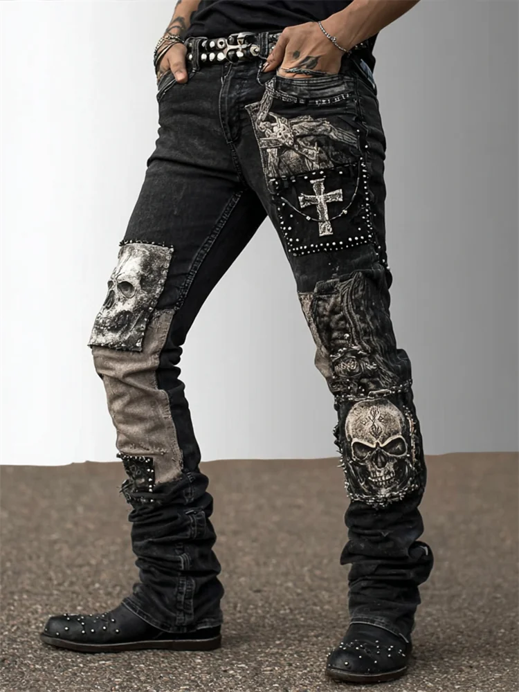 Men's Rock Style Skulls & Cross Studded Patch Stretchy Jeans