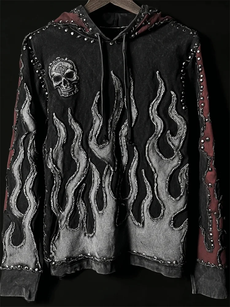 Men's Skull & Contrast Flame Rock Studded Washed Hoodie