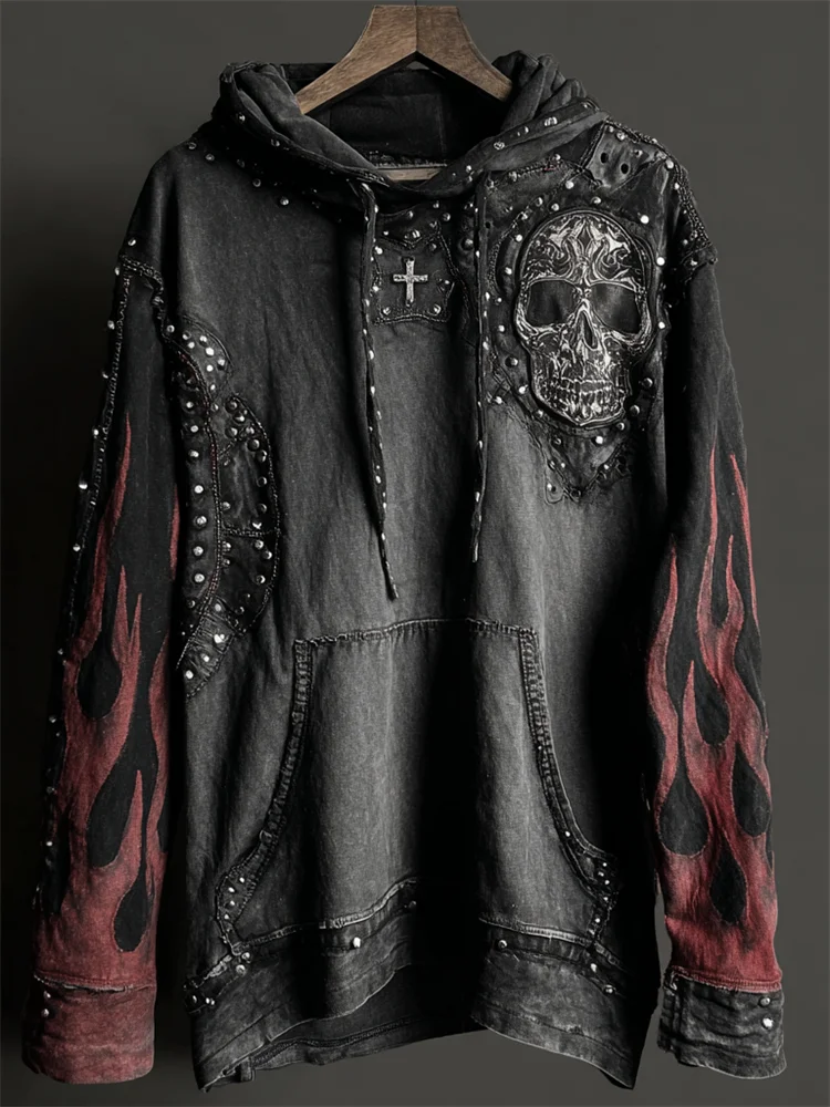 Men's Skull & Cross Flame Rock Studded Washed Hoodie