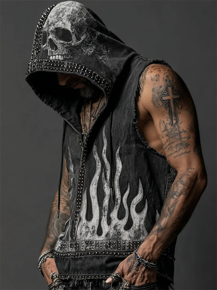 Men's Skull & Flame Rock Studded Hooded Linen Tank