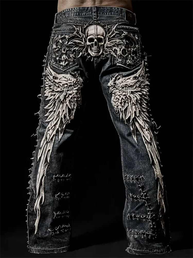 Men's Skull & Wings Rock Studded Washed Bootcut Jeans