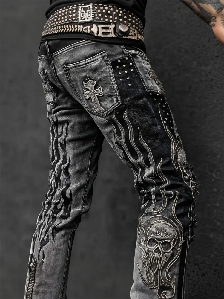 Men's Skulls Cross Flame Contrast Rock Studded Washed Jeans