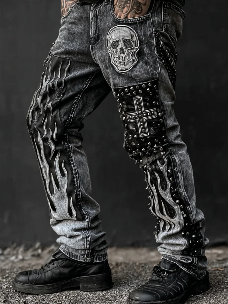 Men's Skulls Cross Patch Flame Bleached Rock Studded Washed Jeans
