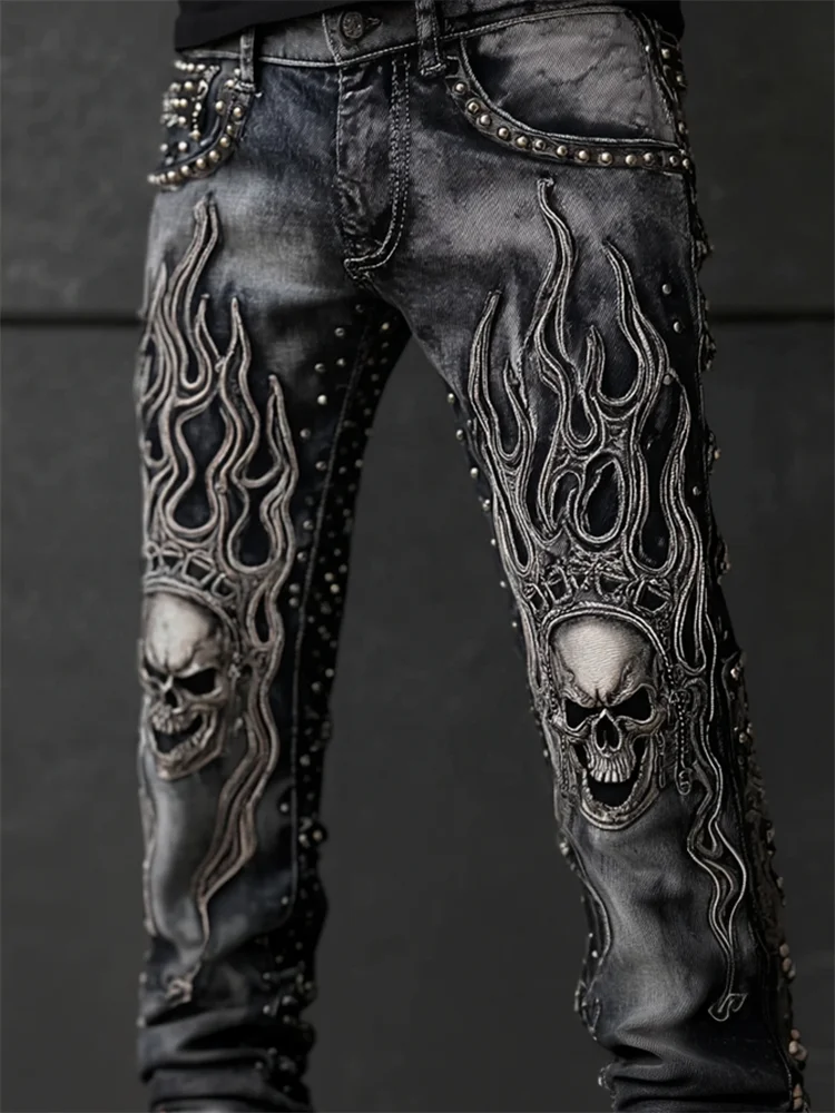 Men's Skulls & Flame Contrast Rock Studded Washed Jeans