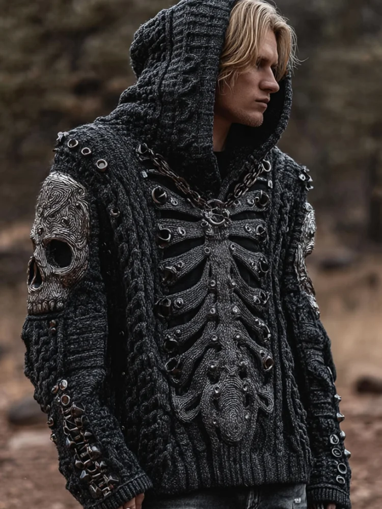 Men's Vintage Dark Skeleton Rivet Washed Long-sleeved Hooded Sweater
