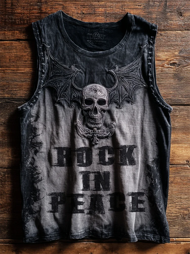 Rock In Peace Bat Wings Skull Memorial Bleached Tank Top