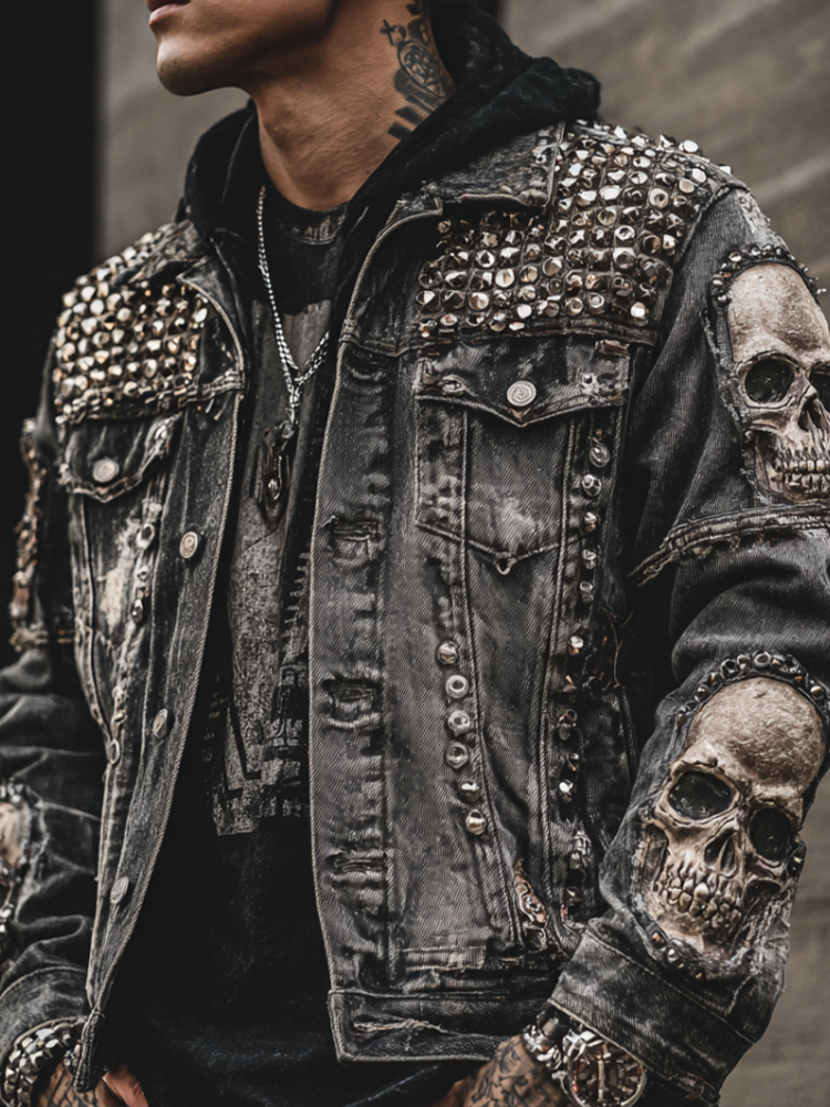 Rock Punk Skull Rivet Element Retro Distressed Heavy-duty Men's Denim Jacket