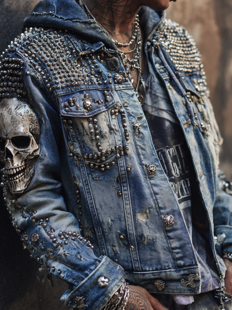 Rock Punk Skull Rivet Element Retro Distressed Heavy-duty Men's Denim Jacket