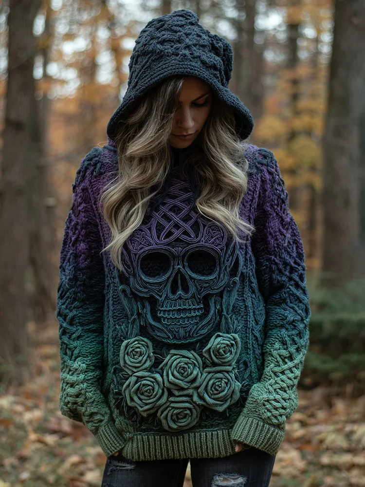 Women's Viking Tribal Jacquard Celtic With Rose And Skull Inspired Chunky Knit Hooded Sweater